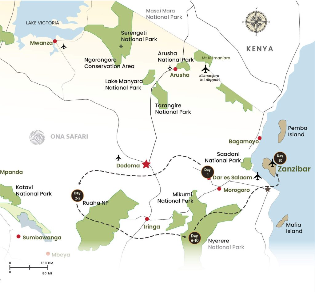 Dar es Salaam ,Ruaha National Park , Nyerere National Park (Selous) , Zanzibar