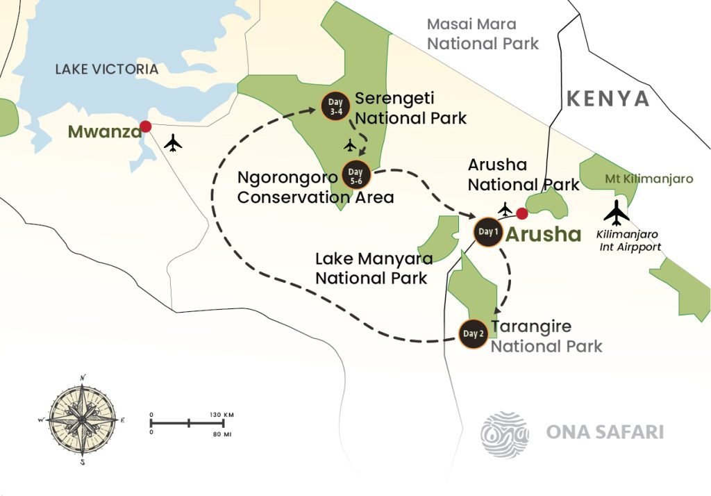 This 6-day Tanzania safari is designed for travelers who want to experience the very best of Tanzania’s iconic wildlife destinations in a short time. Starting in Arusha, the gateway to Tanzania’s northern circuit, the journey takes you to Tarangire National Park, famous for its large elephant herds and giant baobabs, before heading into the endless plains of the Serengeti, where predators roam and the Great Migration thunders seasonally across the land.