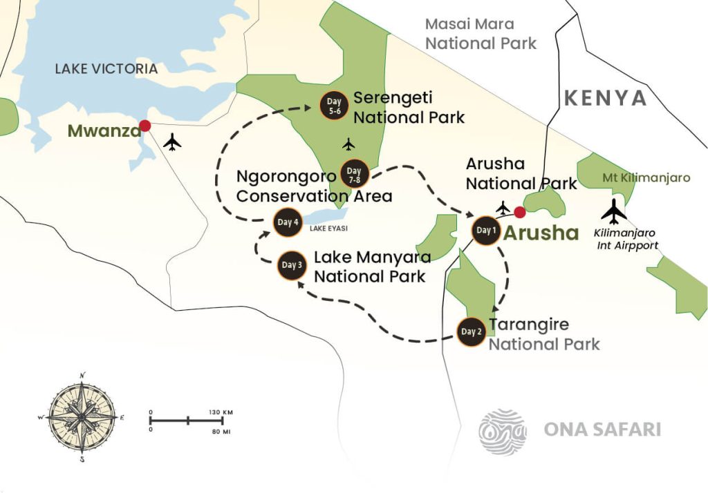 Kilimanjaro/Arusha - Tarangire,Ngorongoro Crater , Central Serengeti National Park